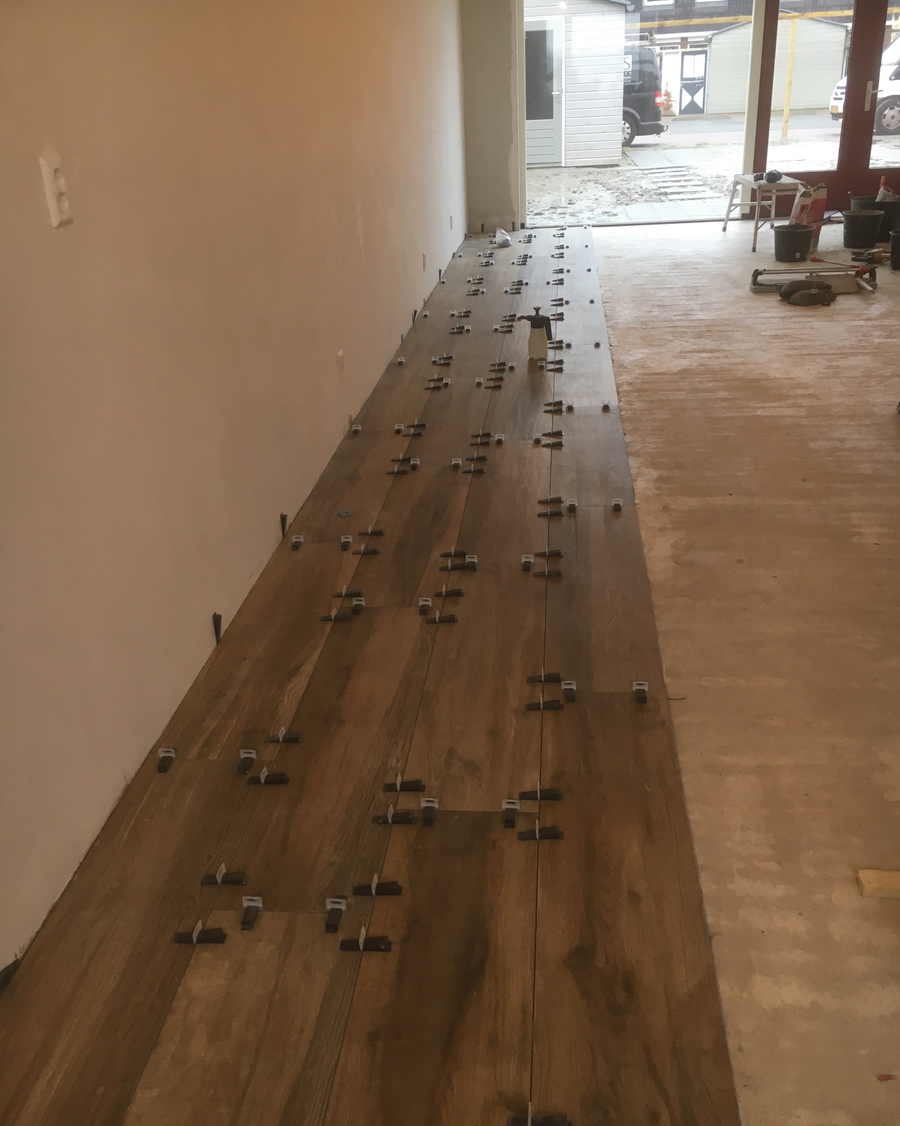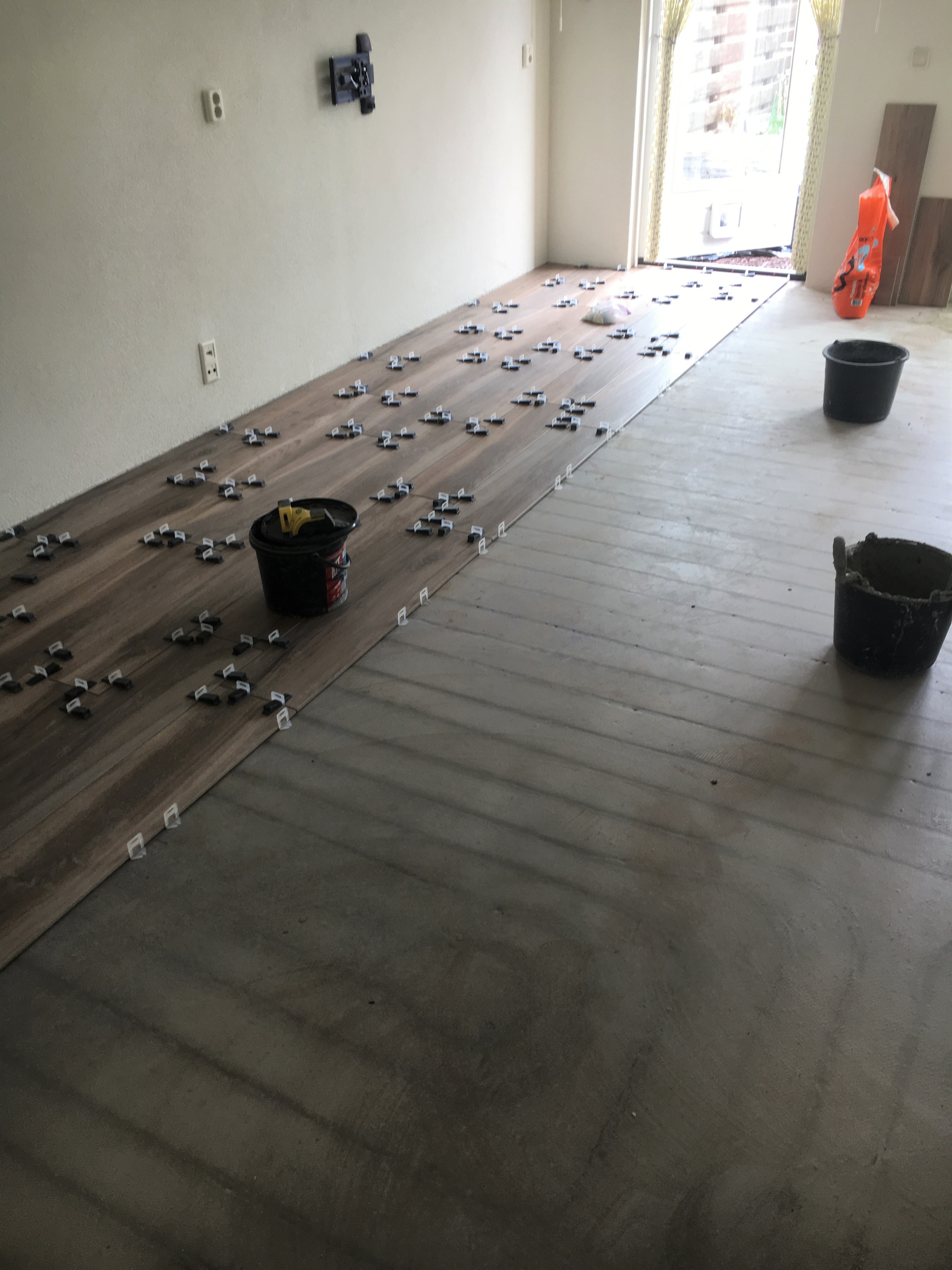 Bij het plaatsen worden tegellevellers gebruikt om een supervlak resultaat te bieden.